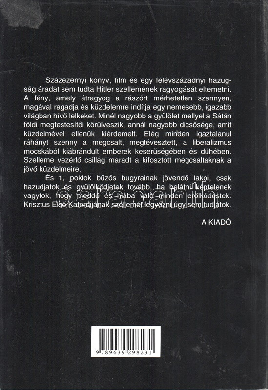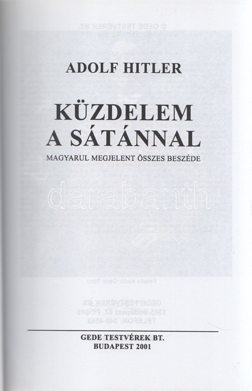 Hitler, Adolf: Küzdelem a sátánnal. Adolf Hitler magyarul megjelent összes beszéde. (Szerkesztette: Gede Tibor.) Budapest, 2001. Gede Testvérek Bt. 1 t. (Hitler színes portréja) + 591 + [9] p. Tartalma: Ungvári Gyula: Hitler Adolf történelmi jelentősége -- A birodalmi kormány kiáltványa a német néphez 1933. március 1-én -- Hindenburg birodalmi elnök beszéde a birodalmi gyűlés megnyitásakor, 1933. március 21-én -- Hitler Adolf a német nép vezérének beszédei: A birodalmi gyűlés megnyitásakor 1933. március 21-én -- A birodalmi gyűlésen, 1933. március 23-án -- A német mezőgazdaság vezetői előtt, 1933. április 5-én -- A nemzeti munka ünnepén, 1933. május 1-én -- A német munkafront kongresszusán, 1933. május 10-én -- A birodalmi gyűlésen, 1933. május 17-én -- A birodalmi helytartók előtt, 1933. július 6-án -- A birodalmi gyűlésen, 1936. március 7-én -- A danzigi beszéde, 1939. szeptember 19-én -- A birodalmi gyűlésen, 1939. október 6-án -- Az Öreg Harcosok emlékünnepén, 1939. november 8-án -- A berlini sportcsarnokban, 1940. január 30-án -- A Német Nemzetiszocialista Párt 20 éves alapítási évfordulója alkalmával Münchenben, 1940. február 24-én -- A birodalmi gyűlésen, 1940. július 19. -- A nemzetiszocializmus győzelmének 8. évfordulója alkalmából a berlini Sportpalotában, 1941. január 30-án -- A párt megalakulásának 21. évfordulója alkalmából, 1941. február 24-én -- A birodalmi gyűlésen, 1941. május 4-én -- A Führer kiáltványa a német néphez, 1941. július 22-én -- A német télisegélymozgalom megnyitása alkalmából a berlini Sportpalotában, 1941. október 3-án -- Franklin D. Roosevelt háborús felelősségéről, a birodalmi gyűlésen 1941. december 11-én -- A berlini Sportpalotában, 1942. április 26-án -- A téli segély gyűjtés megindítása alkalmából a berlini Sportpalotában, 1942. szeptember hó 30-án -- Az elesett hősök napjának emlékünnepén Berlinben, 1943. március 21-én -- Rádióbeszéd az olasz Badoglio-kormány kapitulációjáról, 1943. szeptember 10-én -- A régi harcos bajtárs előtt Münchenben a mozgalom fővárosában, 1943. november 8-án -- A német néphez szóló felhívása és a véderőhöz intézett hadparancsa, 1944. január 1-én -- Rádióbeszéd a hatalom átvételének 11. évfordulóján, 1944. január 30-án -- Függelék: ,,Európa az európaiaké'' nyilatkozat a világhelyzetről a francia hadjárat alatt -- Friedrich Stieve: Amiről a világ hallani sem akart -- A véderő főparancsnokságának jelentései a birodalmi kormányhoz a Németország elleni szovjetorosz felvonulásról. Fűzve, színes, Hitler portréjával illusztrált kiadói borítóban. Hibátlan, szép példány.
