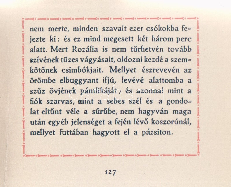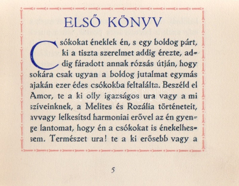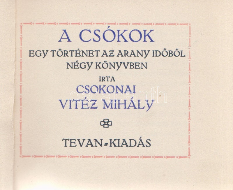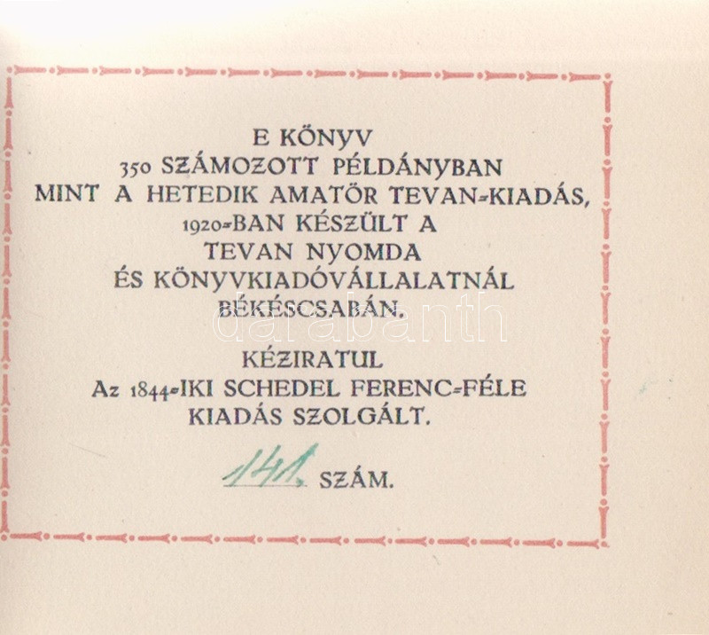 Csokonai Vitéz Mihály: A csókok. Egy történet az arany időből, négy könyvben. (Számozott.) (Békéscsaba, 1920). Tevan-kiadás. 127 + [3] p. Kolofon: ,,E könyv 350 számozott példányban mint a hetedik amatőr Tevan-kiadás, 1920-ban készült a Tevan Nyomda és Könyvkiadóvállalatnál, Békéscsabán. Kéziratul az 1844-iki Schedel Ferenc-féle kiadás szolgált. 141. szám." Keretdíszes szövegoldalakkal, példányunk fűzése enyhén meglazult. Vaknyomásos, hiányos gerincű kiadói kartonkötésben, enyhén foltos, kissé sérült kiadói kartontokban.