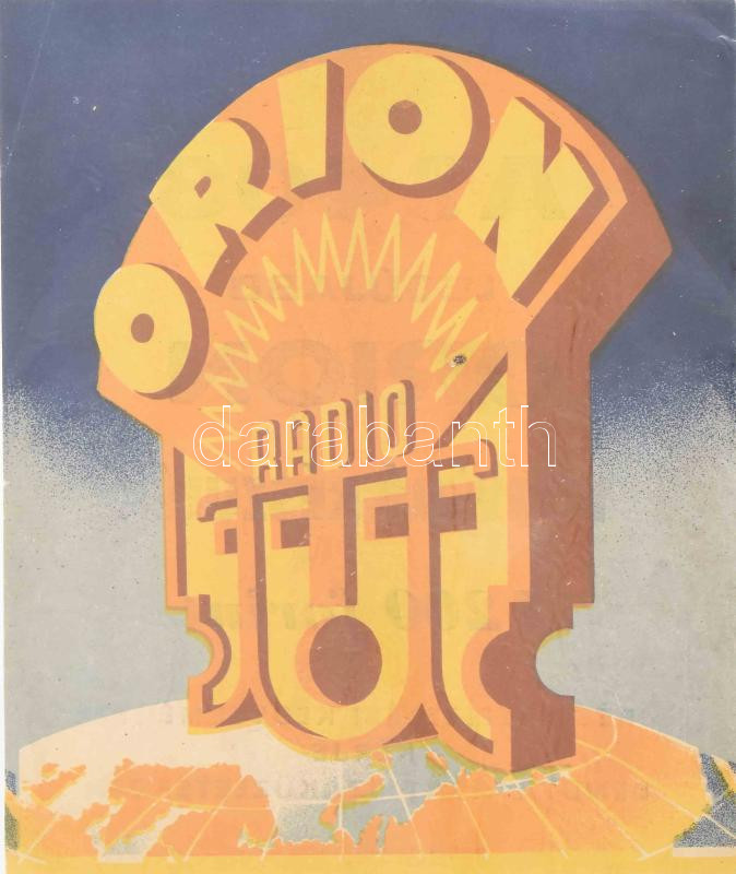 Leírás: Orion AT 403 televízió készülék, dekoratív illusztrált reklám, papír, hátoldalán nyomtatott szöveggel, Sztálinvárosi Nyomda, 20x17 cm