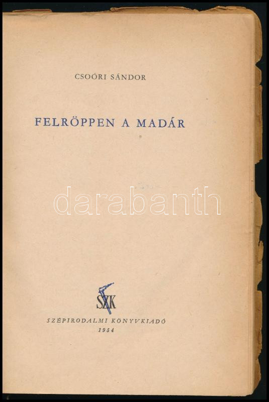 Csoóri Sándor: Felröppen a madár. I. kötet. I. kiadás. 1954, Szépiroda... https://www.darabanth.com/hu/465-Gyorsarveres/465.0/Konyvek/Konyvek-Egyeb-ritkasagok~2500026/Csoori-Sandor-Felroppen-a-madar-I-kotet-I-kiadas-1954-Szepirodalmi-Kiadoi-papirkotes-~II3136361