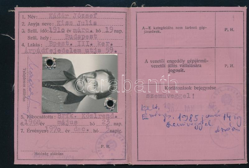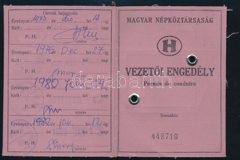 1968-1985 MNK fényképes vezetői engedély (jogosítvány), számos bejegyz... https://www.darabanth.com/hu/465-Gyorsarveres/465.0/Mutargy-papirregiseg-egyeb/Okmanyok~500024/1968-1985-MNK-fenykepes-vezetoi-engedely-jogositvany-szamos-bejegyzessel~II3100648
