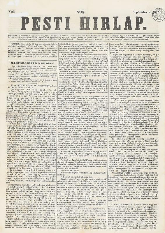 Leírás: 1845 Pesti Hírlap 535. szám, 1845. szept. 9., szerk.: Csengery Antal, kiadja: Landerer Lajos, 1K szignettával, 4 p.