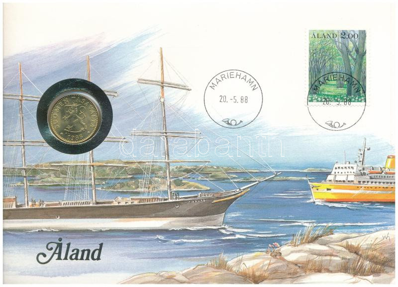 Finnország / Aland 1986. 20p Al-bronz felbélyegzett borítékban, bélyegzéssel, német nyelvű leírással T:UNC patina Finland / Aland 1986. 20 Penniä Al-bronze in envelope with stamp, cancellation and a prospectus in german C:UNC patina