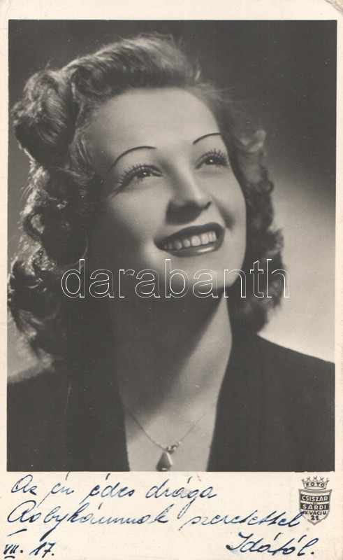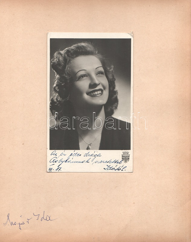 Major Ida (1920-2005) színésznő, énekesnő, bábművész, előadóművész fiatalkori, Rátonyi Róbertnek dedikált fényképe: ,,Az én édes drága Robykámnak szeretettel Idától, VII. 17." Mérete: 140x85 mm, egy 245x190 mm-es kartonlapra ragasztva. A felvételt Csiszár és Sárdi műterme készítette. A művésznő Kellér Dezső (1905-1986) író, humorista, konferanszié felesége volt.