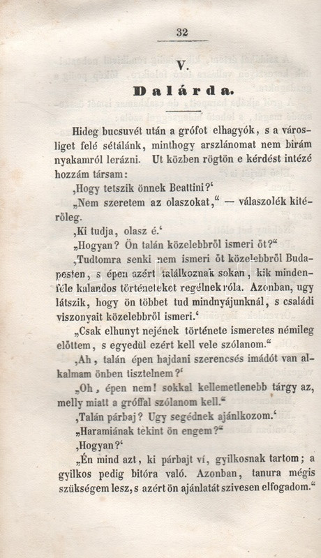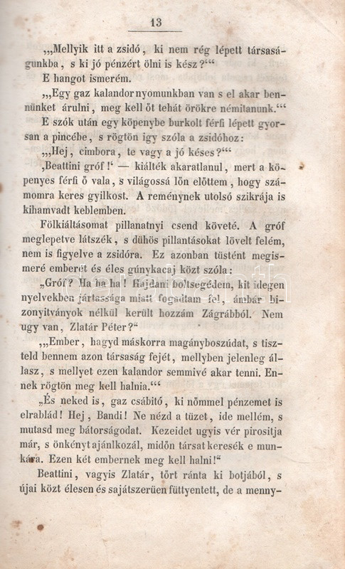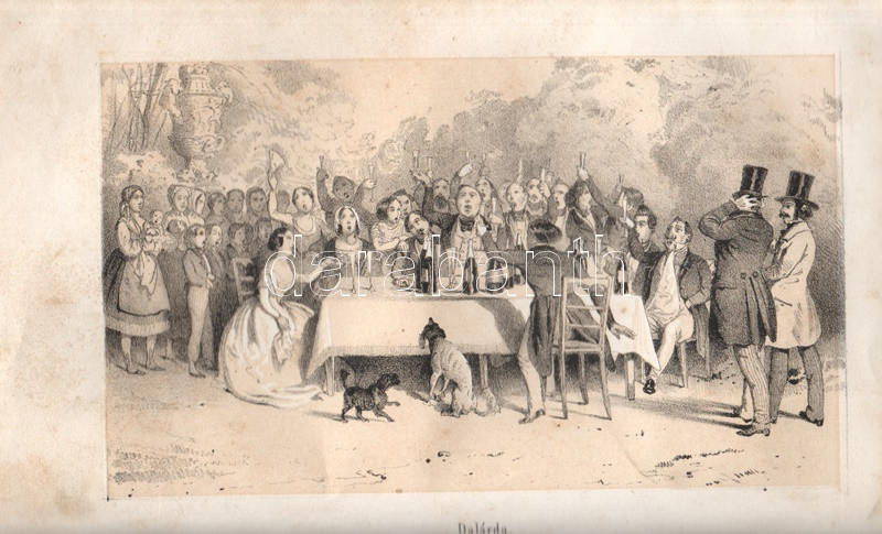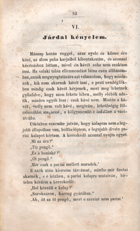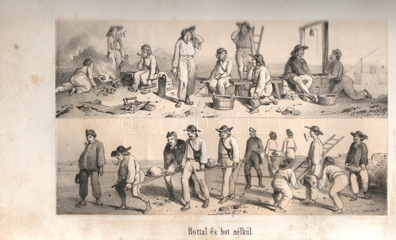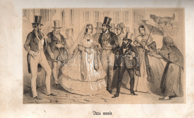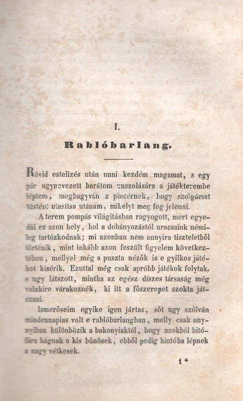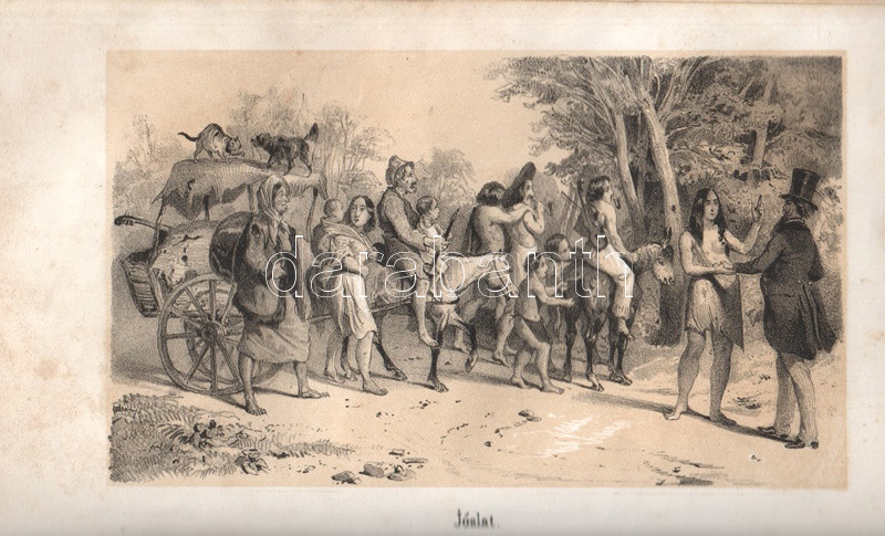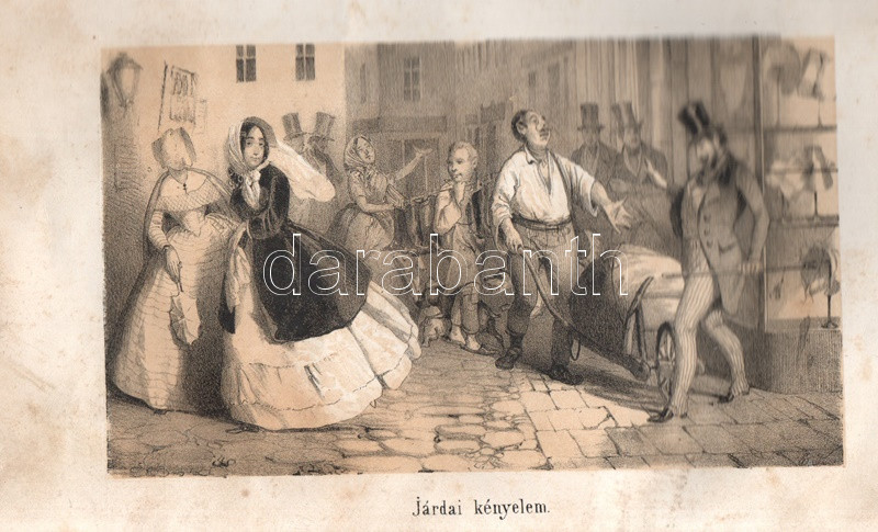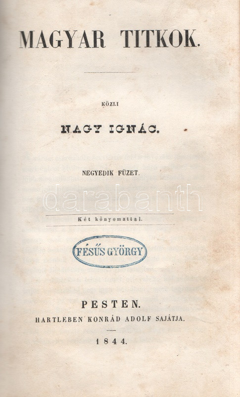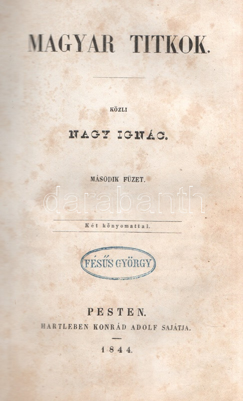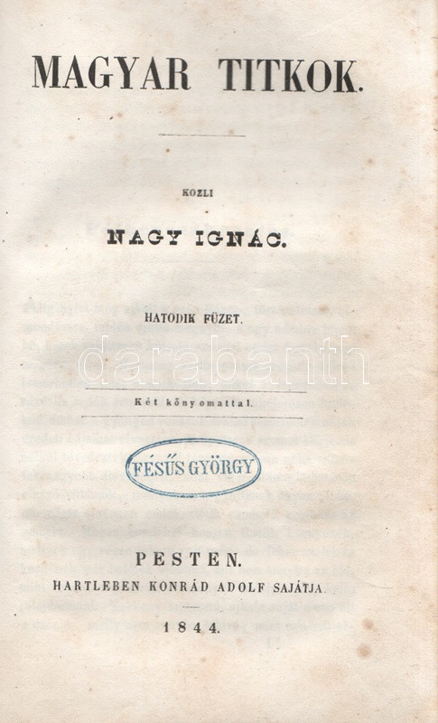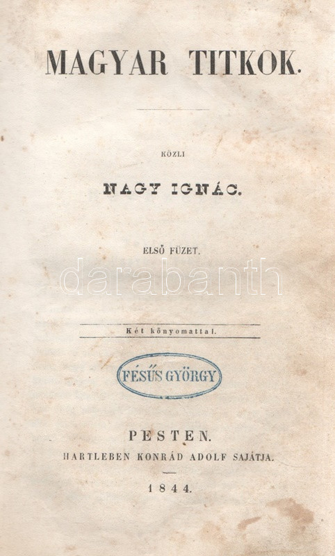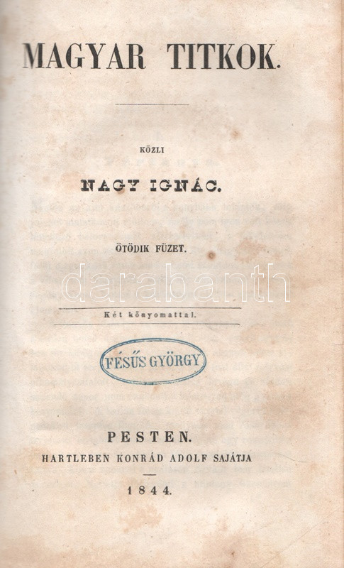 Nagy Ignác: Magyar titkok. Közli Nagy Ignác. Első-hatodik füzet. [Egybekötve.] Pesten, 1844. Hartleben Konrád Adolf sajátja (Nyomatott Landerer és Heckenastnál). 80 p. + 2 t. (tónusos kőnyomat); 93 + [1] p. + 2 t. (tónusos kőnyomat); 77 + [3] p. + 2 t. (tónusos kőnyomat); 78 + [2] p. + 2 t. (tónusos kőnyomat); 88 p. + 2 t. (tónusos kőnyomat); 86 p. + 2 t. (tónusos kőnyomat). Első kiadás. Nagy Ignác (1810-1854) író, drámaíró, újságíró, lapszerkesztő, a XIX. századi értelemben vett humoros életképek mestere, társadalmi típusok szórakoztató leírója. ,,Magyar titkok" néven ismert munkája, fő műve - e szatirikus bűnügyi kalandregény - a reformkori próza egyik jelentős teljesítménye, mely témájában és folytatásos közlési formájában is újdonságot jelentett a magyar irodalomban. Nagy Ignác munkája az Eug?ne Sue-féle párizsi rémregény magyarországi meghonosítása, melyben keverednek a néprajzos ihletésű vidéki és a párizsi ihletésű pesti szatirikus életképek, melyeket a markánsan bűnügyi cselekmény tart egyben. Bár a szeriális szerkesztésben, illetve az emlékezetes hátterű városi zsánerfigurák megteremtésében Nagy Ignác sokat tanult Eugéne Sue-től, a kalandokat mégis tekinthetjük a reformkori Pest egyfajta szaritikus bédekkerének. A teljes mű tizenkét füzetben jelent meg. A címoldalakon régi tulajdonosi bélyegzés, az oldalakon foxing, egyes oldalakon apró foltosság. Poss.: Fésüs György. [Fésüs György (1841-1914) jogász, jogi szakíró, a kassai, majd a pozsonyi jogakadémia tanára.] Szüry: 3337. Aranyozott gerincű, enyhén sérült gerincű, enyhén kopott korabeli egészvászon kötésben. Jó példány.