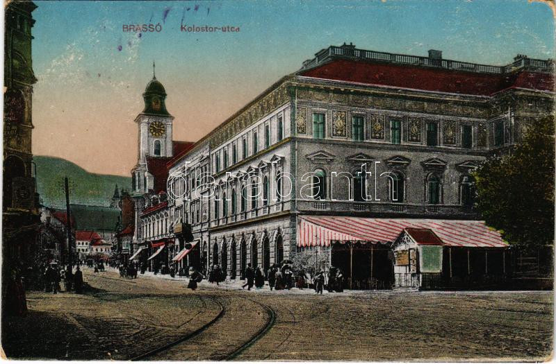 Leírás: 1918 Brassó, Kronstadt, Brasov; Kolostor utca, üzletek. Vasúti levelezőlapárusítás 226. / street view, shops (EK)