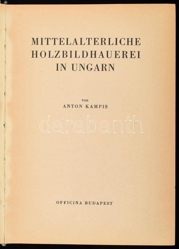 Kampis, Anton: Mittelalterliche holzbildhauerei in Ungarn. Kampis Antal: Középkori faszobrászat Magyarországon. A Magyarságtudomány Könyvei III. Bp., 1940., Officina, XLII+2+313+3 p. A 155. oldaltól fekete-fehér képtáblákkal illusztrált. Kiadói félvászon-kötés, kopott borítóval és gerinccel.