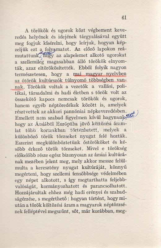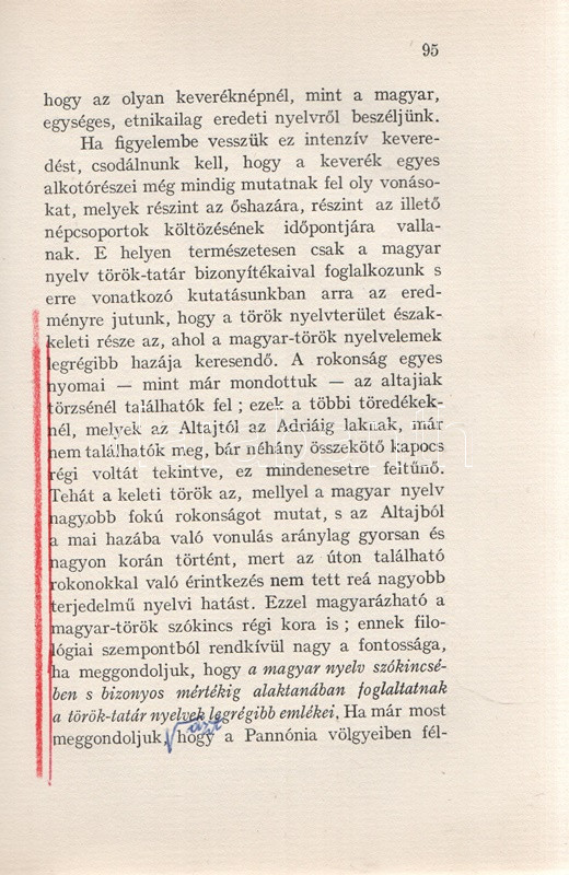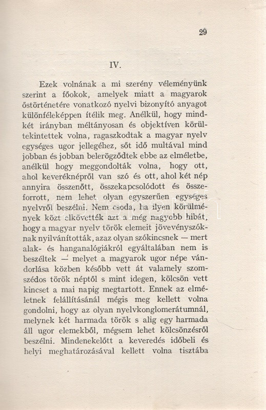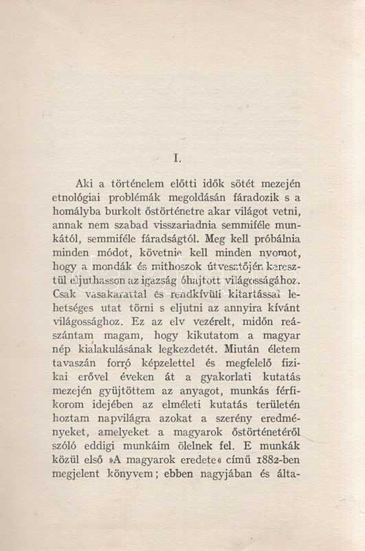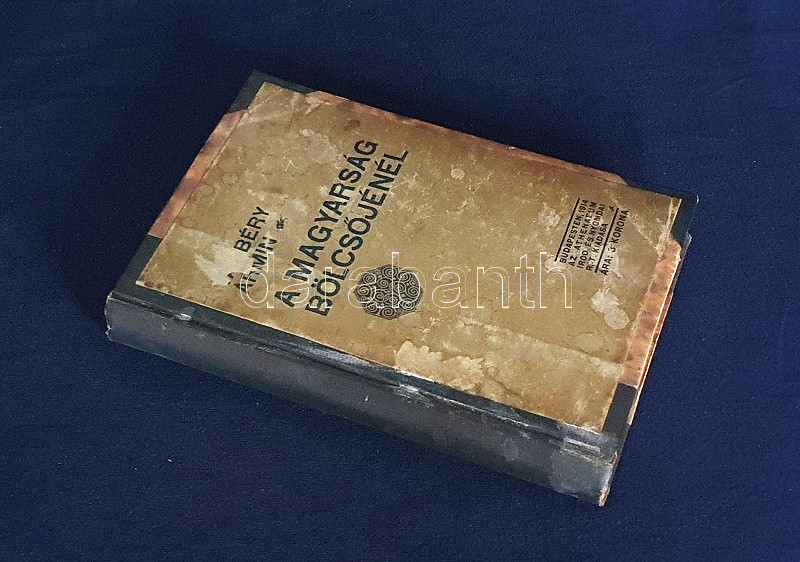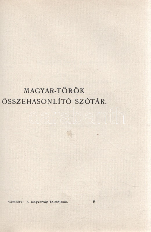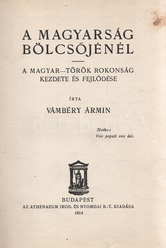 Vámbéry Ármin: A magyarság bölcsőjénél. A magyar-török fajrokonság kezdete és fejlődése. Budapest, 1914. Athenaeum Irodalmi és Nyomdai Rt. 223 + [1] p. Első kiadás. Vámbéry Ármin (1832-1913) orientalista, turkológus, egyetemi tanár, tanszékalapító posztumusz kötete, egyben legutolsó álláspontja a magyar nyelvtörténetet és őstörténetet megrázó ugor-török háború kérdésében. Az ugor-török háború a keleti tanszéket alapító Vámbéry 1869/1870. évi vitairatától kezdődik, és tétje a magyar nép és nyelv eredetének korántsem tét nélküli meghatározása volt. Vámbéry a kérdésben azt az álláspontot képviselte, hogy az ugor nyelvek és a törökségi nyelvek közeli rokonságban állnak, erre pedig grammatikai és szókészlet-béli bizonyítékokat hozott. A finnugor elméletet képviselő Budenz József és Hunfalvy Pál a tudományos alaposságot kérte számon Vámbéry Árminon, illetve kritizálta Vámbéry azon elméletét, mely szerint a magyar nyelv és nép ugor-török keverék lenne. Az ugor-török háború évtizedeken keresztül zajlott, személyeskedésektől sem volt mentes, Vámbéry Ármin pedig soha nem adta fel törökségi álláspontját, melynek legvégső kifejtése posztumusz kiadott könyvében található. Kötete a törökségi származás fenntartásával magyarázattal szolgál a hun-magyar rokonságra is, ekképp pedig hozzájárult László Gyula régész későbbi kettős honfoglalás-elméletéhez is. A címlapon apró foltosság. Az eredeti illusztrált fedőborító felhasználásával készült korabeli, enyhén foltos kiadói félvászon kötésben.