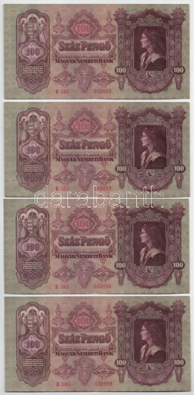 1930. 100P (4x) "E080" sorszámkövetők és közeli sorszámok T:VF Adamo P... https://www.darabanth.com/hu/478-Gyorsarveres/478.0/Numizmatika/Magyar-bankjegyek~2000008/1930-100P-4x-E080-sorszamkovetok-es-kozeli-sorszamok-T-VF-Adamo-P17~II3261943