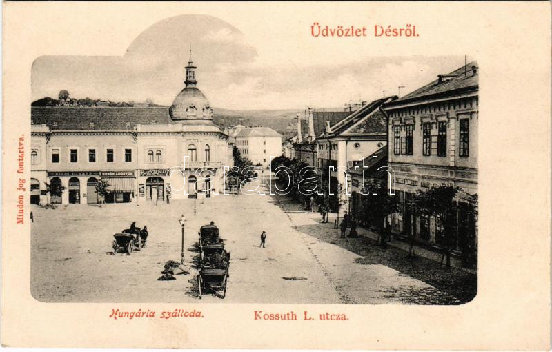 Dés, Dej; Hungária szálloda, Kossuth Lajos utca, Fesztinger Sámuel és fia, Bakó Mihály, Rehák Ágoston és Klein Ignátz üzlete / street, shops