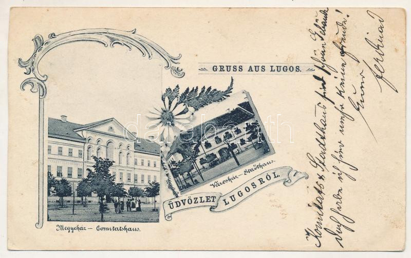 Leírás: Lugos, Lugoj; Megyeház, Városház / county and town halls. Art Nouveau, floral (vágott / cut)