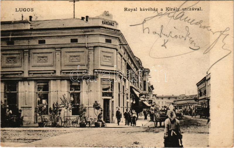 Lugos, Lugoj; Royal kávéház, Király utca / cafe, street (EK) https://www.darabanth.com/hu/479-Gyorsarveres/479.0/Kepeslapok/Erdely~2000006/Lugos-Lugoj-Royal-kavehaz-Kiraly-utca-cafe-street-EK~II3268432