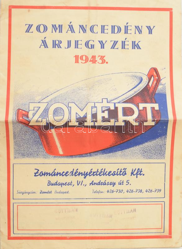 Leírás: 1943 ZOMÉRT. Zománcedények árjegyzék. Bp., Közlekedési-ny., hajtott, 4 sztl. lev.