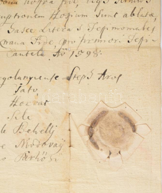 Leírás: 1598 Az Ugocsa megyei (ma Szatmár megyei) Tivadar községben lakó nemesek testimoniális levele a Nagy család nemessége tárgyában viaszpecséttel