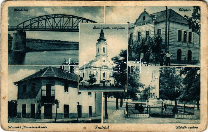Leírás: 1936 Endrőd (Gyomaendrőd), Körös híd, Római katolikus templom, Katolikus népház, Hősök szobra, Homoki József üzlete és saját kiadása (fl)