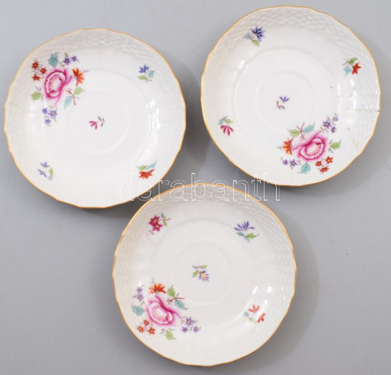 3 db Herendi Eton mintás teás csészealj kézzel festett, jelzett, repedt d: 14 cm