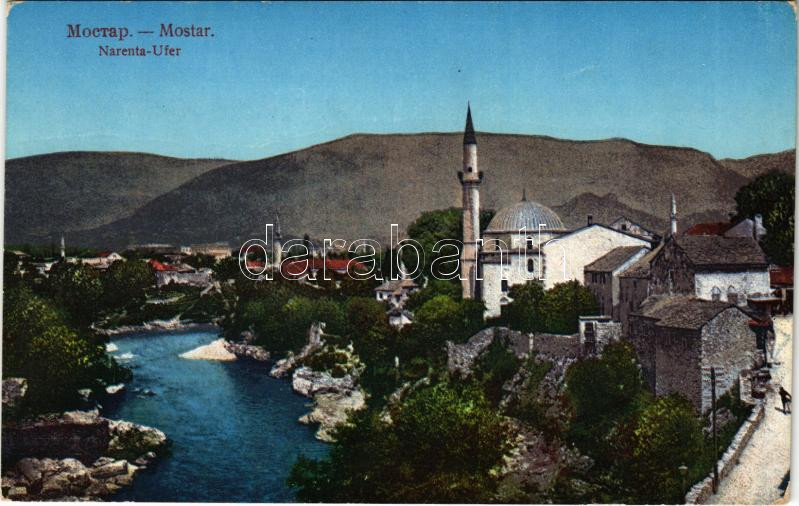 Mostar, Narenta-Ufer / riverside, mosque (EK) https://www.darabanth.com/hu/498-Gyorsarveres/498.0/Kepeslapok/Bosznia-Hercegovina~3000037/Mostar-Narenta-Ufer-riverside-mosque-EK~II3154074
