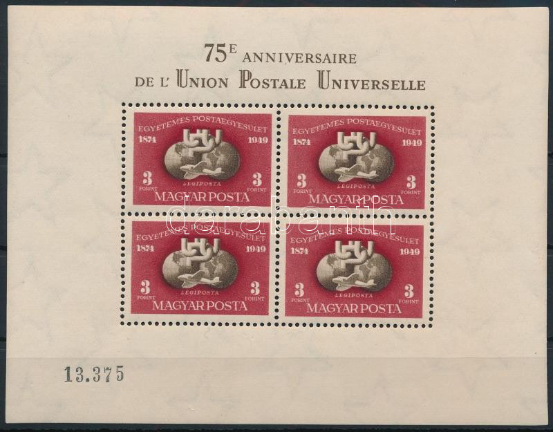 Leírás: 1950 UPU blokk 13.375 rendkívül magas sorszámmal, a középrész enyhe gépszínátnyomatával (180.000++)