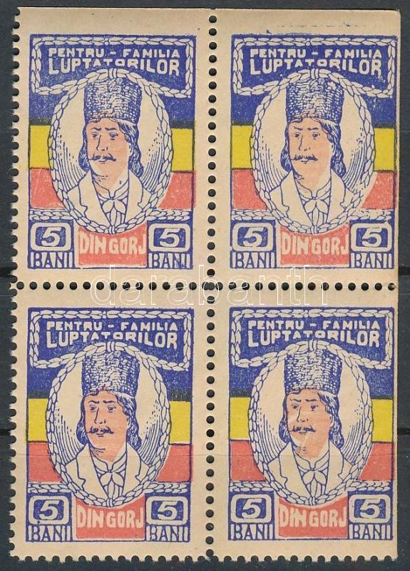 Leírás: Románia 1919 Gorj megye helyi illetékbélyeg 5 Bani 4-es tömbben, két oldalon vágott