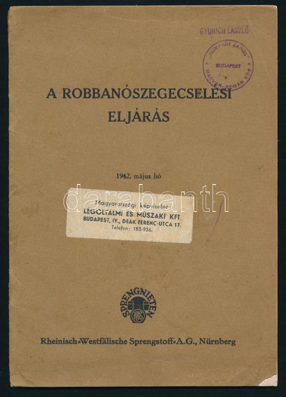 A robbanószegecselési eljárás 1942. május hó. Nürnberg. Rheinisch-Westfallische Sprengestoff AG. Nürnberg. képes katalógus 27 p. Légoltalmi és műszaki kft.