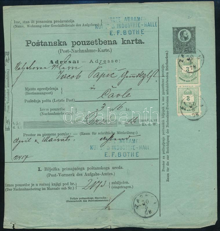 1878 Horvát-német nyelvű díjjegyes postai utánvételi jegy 3kr pár kiegészítéssel "ZAGREB" -"CAVLE"