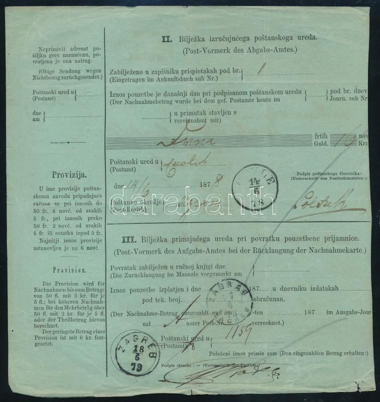 1878 Horvát-német nyelvű díjjegyes postai utánvételi jegy 3kr pár kieg...