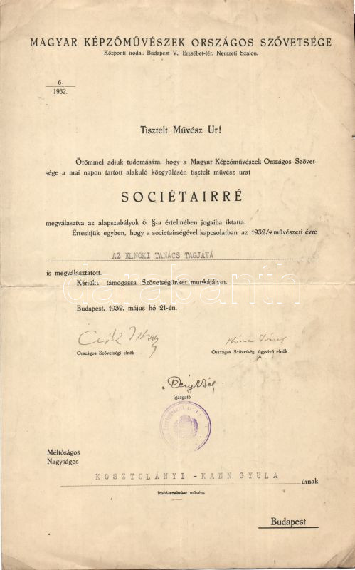 Leírás: 1932 Csók István, Róna József, Déry Béla festő aláírása